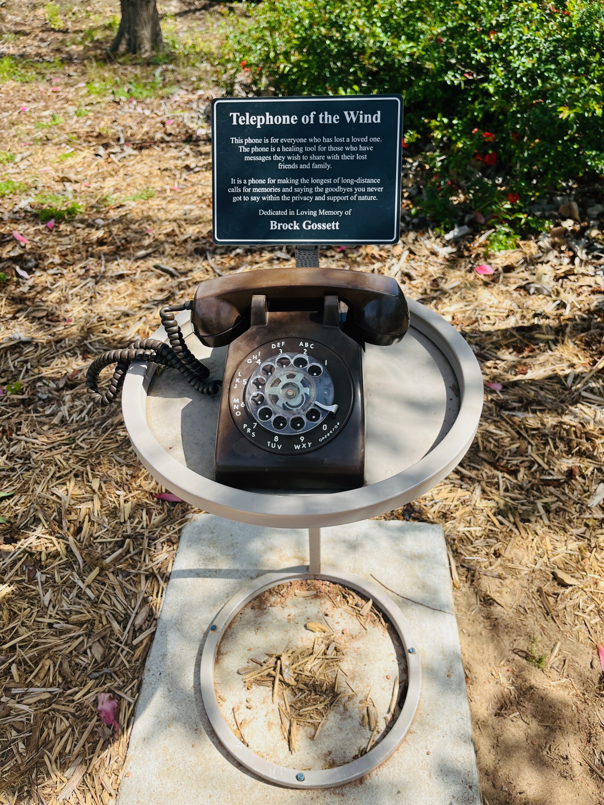 My feet led me to the left. The purple flowers caught my attention. Off to the side was this old rotary dial phone. I smiled. I loved these phones as a kid. But it was the sign that choked me up.